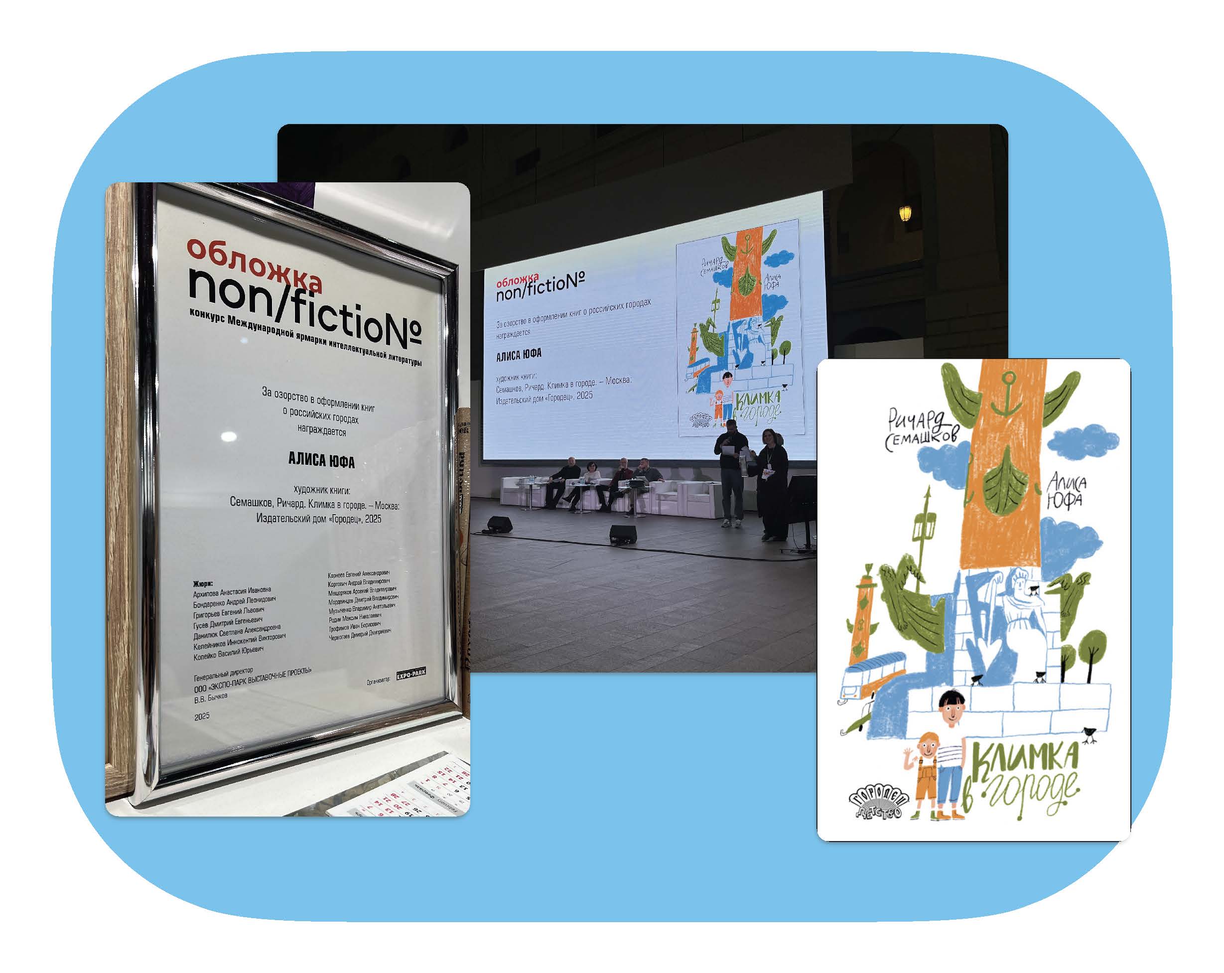 В Москве в Гостином дворе были объявлены победители конкурса «Обложка Non/fictio№». В номинации «детские книги» была награждена художник книги Ричарда Семашкова «Климка в городе» Алиса Юфа «за озорство в оформлении книг о российских городах».