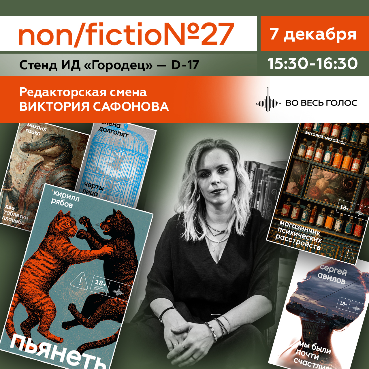 Виктория Сафонова — куратор серии «Во весь голос», директор магазина «Во весь голос» в Санкт-Петербурге. Послушать о новинках и личном выборе Виктории можно будет на стенде D-17 — ИД «Городец» 7 декабря с 15:00 по 16:00.